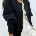 Tento elegantní svetr je navržen s čistým kulatým výstřihem a elegantními perlovými detaily, které dodávají outfitu jemný závěr. Měkký úplet se spojuje s dlouhými rukávy a pružnými manžetami, čímž vytváří čistý a upravený siluetu. Roztrhané okraje spodního lemu a rukávů přinášejí jemný moderní kontrast k klasickým perlovým detailům.