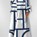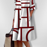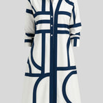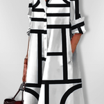 Toto je šaty, které si můžete bez obav obléct od rána do večera. Moderní geometrický vzor zachycuje světlo a pohledy, zatímco splývavý střih a klasický límec vytvářejí elegantní a zároveň uvolněný vzhled. Lehký, na těle příjemný a snadno stylovatelný – tyto šaty nabízejí pohodlí a stylovost v každé situaci.