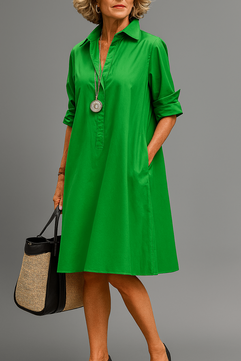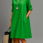 Šaty Bernadette jsou oslavou klasické elegance a decentní sebevědomí. Jejich jasné linie, hluboký smaragdově zelený odstín a rafinovaný střih vytvářejí vzhled, který nikdy nevyjde z módy. Ať už jdete na večeři, hostíte zahradní párty, nebo se jen chcete obléknout krásně, v šatech Bernadette se styl a bezstarostnost spojují. Strukturovaný límec, zapínání na knoflíky a mírně rozšířená A-linie lichotí postavě bez zbytečných ozdob. Jasná, čistá barva mluví sama za sebe — vytváří vzhled, který je současně decentní a působivý. Jednoduché, rafinované, nezapomenutelné.