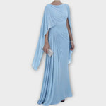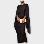 Make a breathtaking entrance with this beautifully draped evening gown designed to flatter your figure with effortless sophistication. Its sculpted silhouette and dramatic cascading sleeve create a luxurious statement perfect for any special occasion.