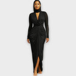 Make a breathtaking entrance in this flawlessly draped evening gown designed to accentuate your curves with timeless sophistication. Its dramatic silhouette and luxurious details make it perfect for galas, formal events, or unforgettable nights out.
