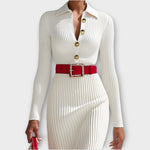Elegant Ribbed Knit Midi Dress with Gold Button Detail