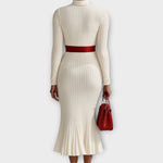 Turn heads in this timeless ribbed knit midi dress that blends sophistication with modern flair. The figure-flattering silhouette and bold red accents make it the perfect choice for date nights, events, or elegant everyday wear.