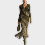 Turn every step into a statement with this bold knit maxi dress featuring a unique camouflage-inspired design and dramatic fringe hem. Designed to hug your curves while offering all-day comfort, it blends chic attitude with effortless movement.
