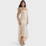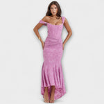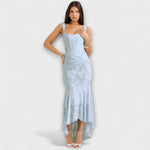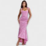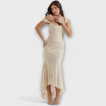 This stunning long dress combines elegance and femininity, with romantic details and a body-hugging fit. The corset with draped design accentuates the waist, while the asymmetrical skirt adds movement and grace to every step you take.