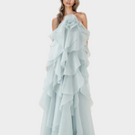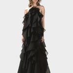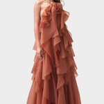 This stunning long dress in a warm terracotta hue exudes luxury and romance. Designed with multi-layered ruffles made from lightweight and airy fabric, it creates an impressive movement with every step you take.