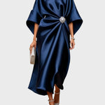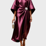 Exuding luxury and timeless elegance, this satin dress is the epitome of sophistication. Its unique silhouette combined with the decorative buckle highlights the figure with a subtle shimmer.