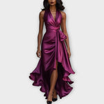 Make a statement of pure elegance with our Satin Halter Gown — designed to flatter and flow with every movement. The graceful draped waist tie and cascading hemline create a look of effortless sophistication, perfect for evening occasions or special events.