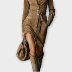 Turn heads with this chic suede belted shirt dress that combines elegance with a touch of Western flair. Its soft texture, structured silhouette, and flattering waist belt make it a timeless piece for any stylish wardrobe.