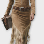 Capture bold western charm with this elegant fringe midi dress. Designed with a tailored fit, a front zip detail, and a flattering belted waist, it brings effortless sophistication to your wardrobe. The playful fringe hemline adds movement and character, making it the perfect choice for both day and evening occasions.